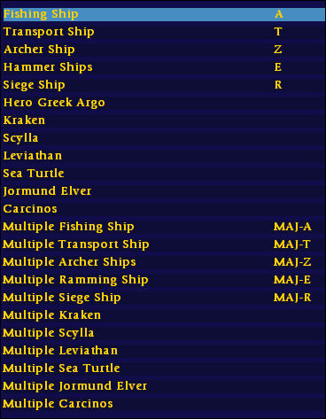 Voici les raccourcis pour mon port. Comme vous pouvez le voir les unités mythiques ne m'intéressent pas, j'ai simplement configuré les bateaux.