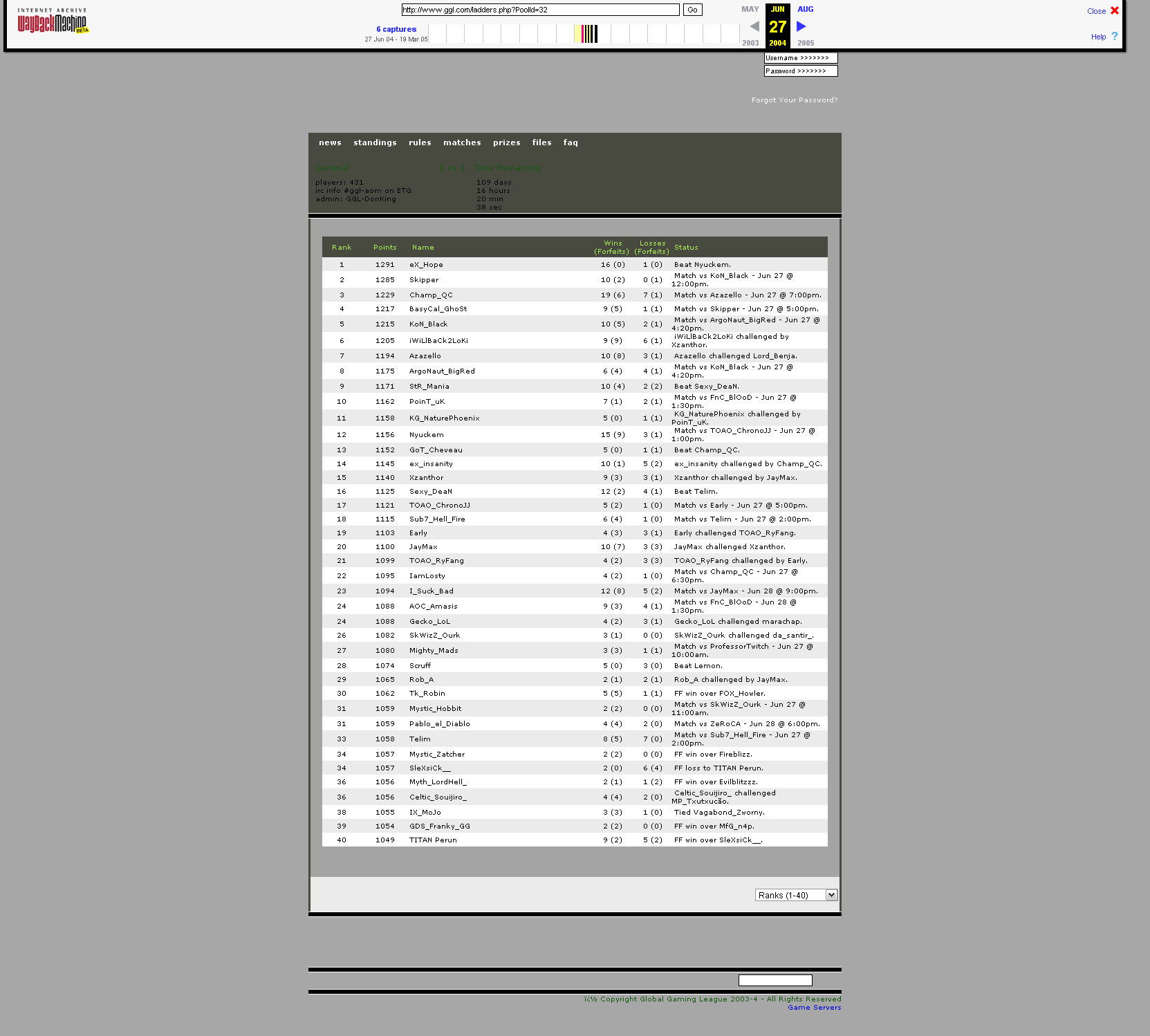 Donc le principe était simple puisque chaque semaine les joueurs inscrits avaient un match à jouer. Le gagnant remportait des points sur son rating Arena (1000 de base je crois) et le perdant en perdait logiquement. Chaque semaine le système désignait un nouvel adversaire et les deux joueurs devaient prendre rendez-vous grâce au messenger/mail du site, comme ça le staff pouvait contrôler qui faisait un effort pour jouer le match et éventuellement donner la victoire à ce joueur si le match n'était pas joué. Les joueurs avaient toute la semaine (lundi au dimanche soir) pour jouer ce match mais parfois ça ne suffisait visiblement pas avec des joueurs qui oubliaient le match ou qui ne faisaient aucun effort sur les horaires des matchs.