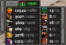 Par exemple, si vous avez un débit en nourriture de 550 unités par 30 secondes de jeu, alors que la limite de commerce est de 500 unités par 30 s, vous n'aurez que 500 unités de nourriture en plus dans vos stocks toutes les 30s, ce qui signifie que certains de vos fermiers travaillent pour rien ! Il faut donc surveiller de près cette limite affichée en permanence dans la barre de ressources en haut à gauche de l'écran.
